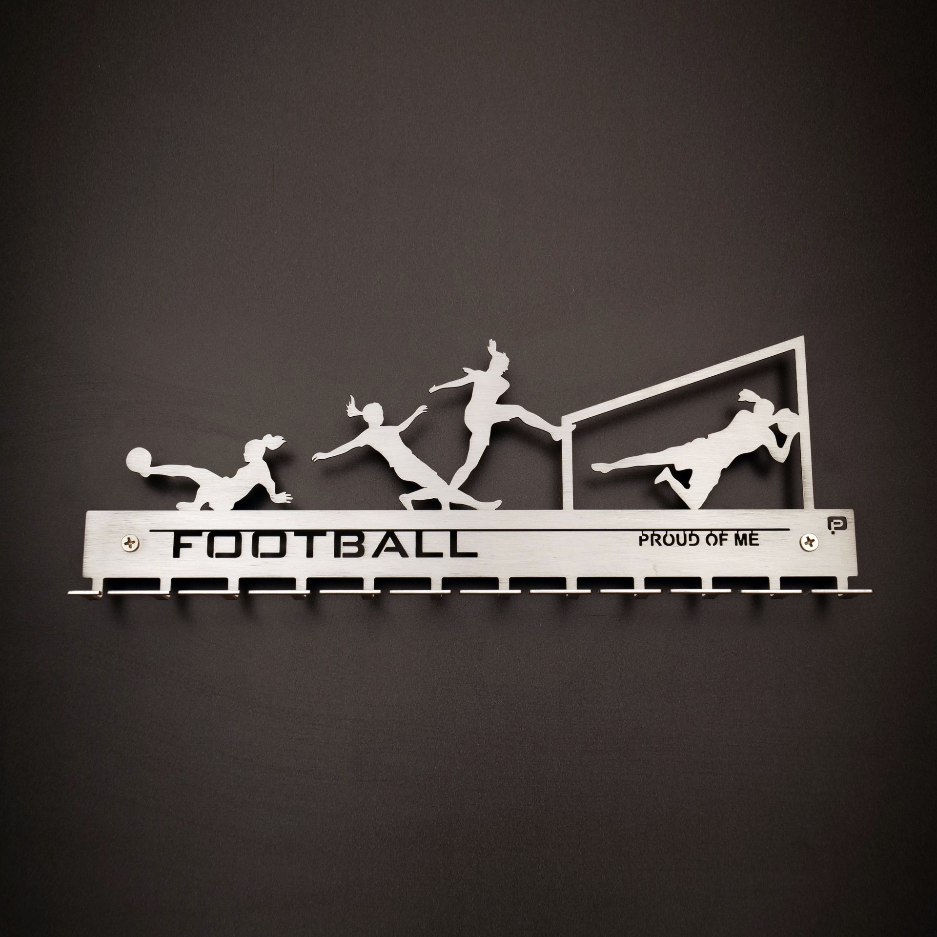 Goloooooooooo! Equipa, finta, disputa, entrega e competição no futebol presentes neste porta medalhas.