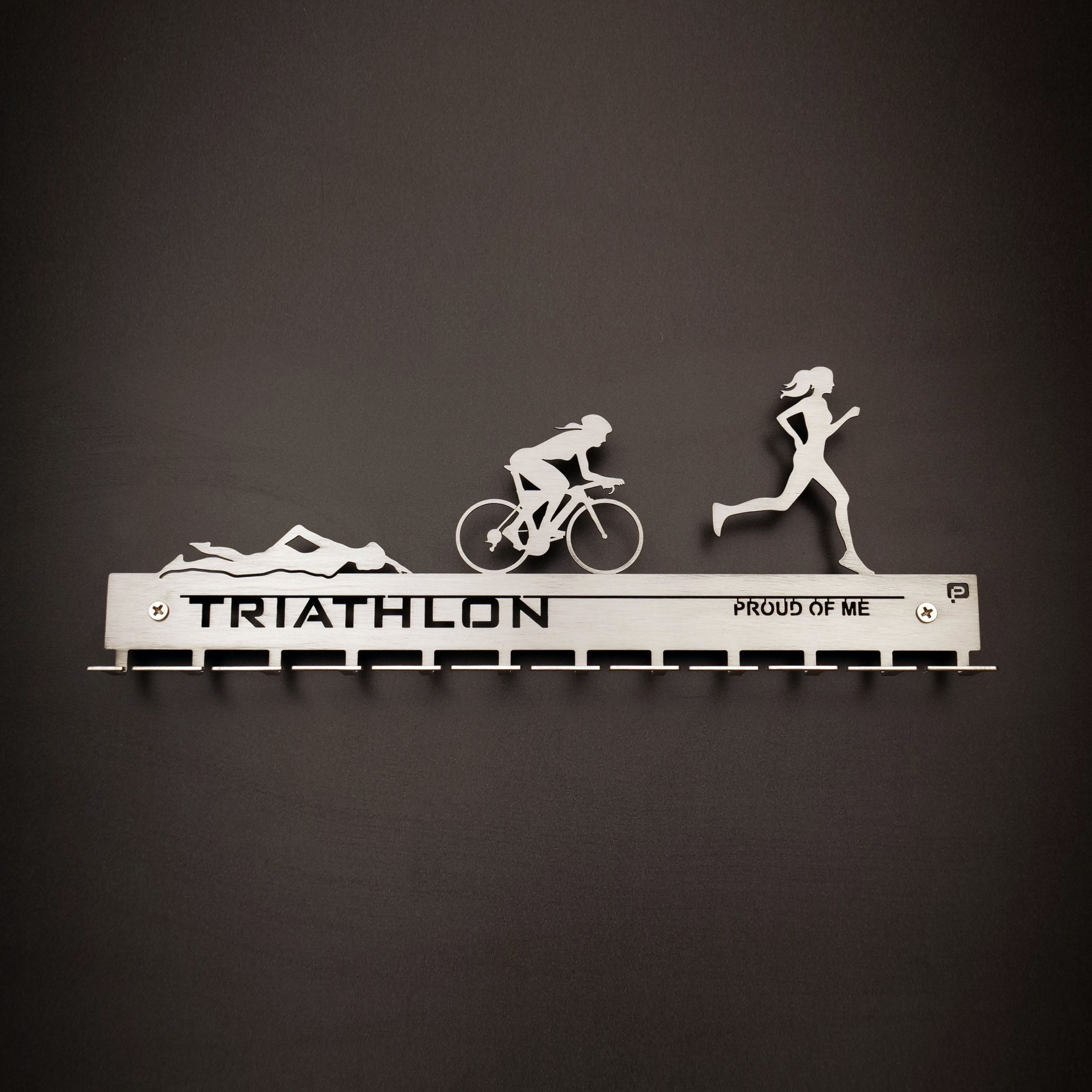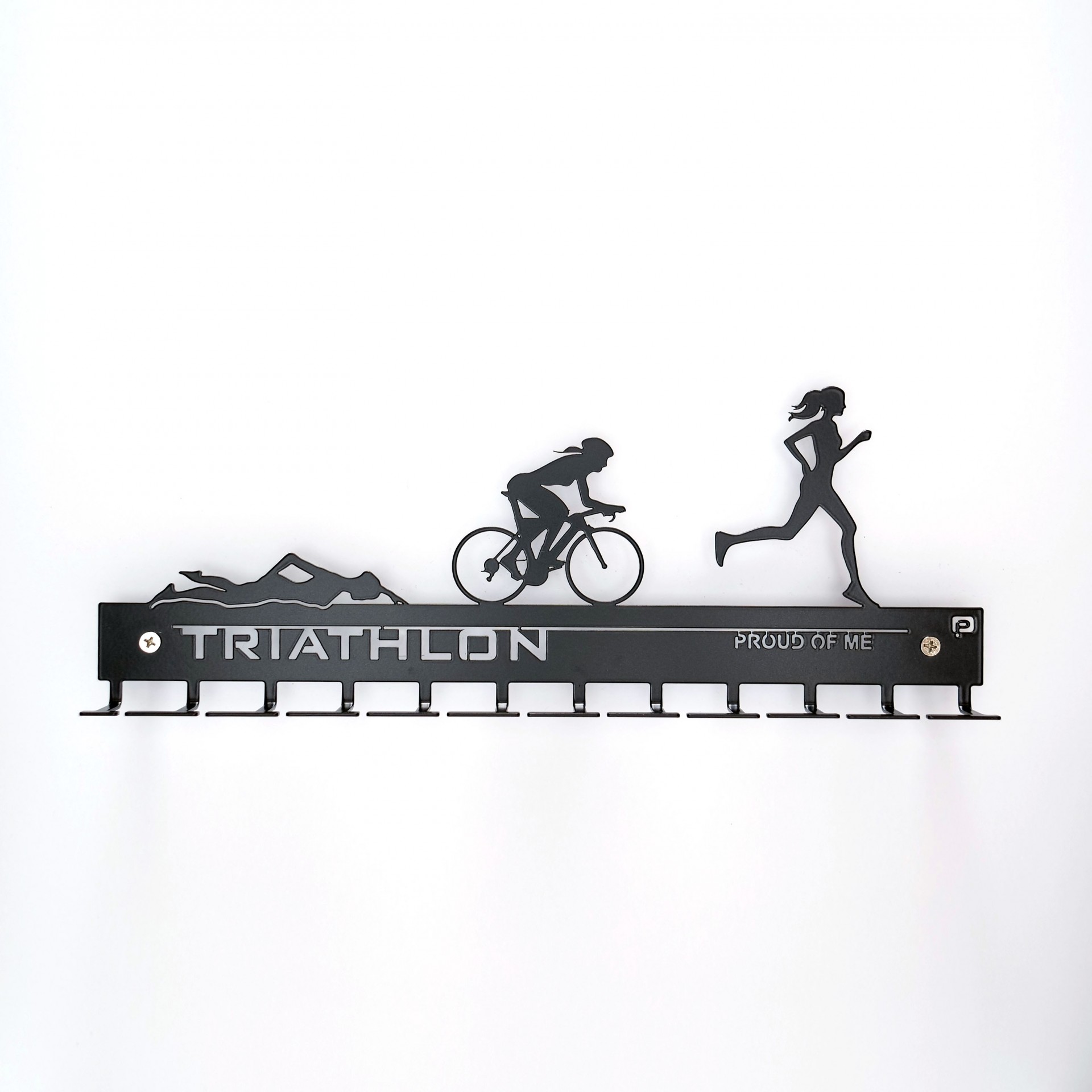 Simetria perfeita entre o corpo e a mente! A junção da natação, corrida e ciclismo evidentes neste porta medalhas.