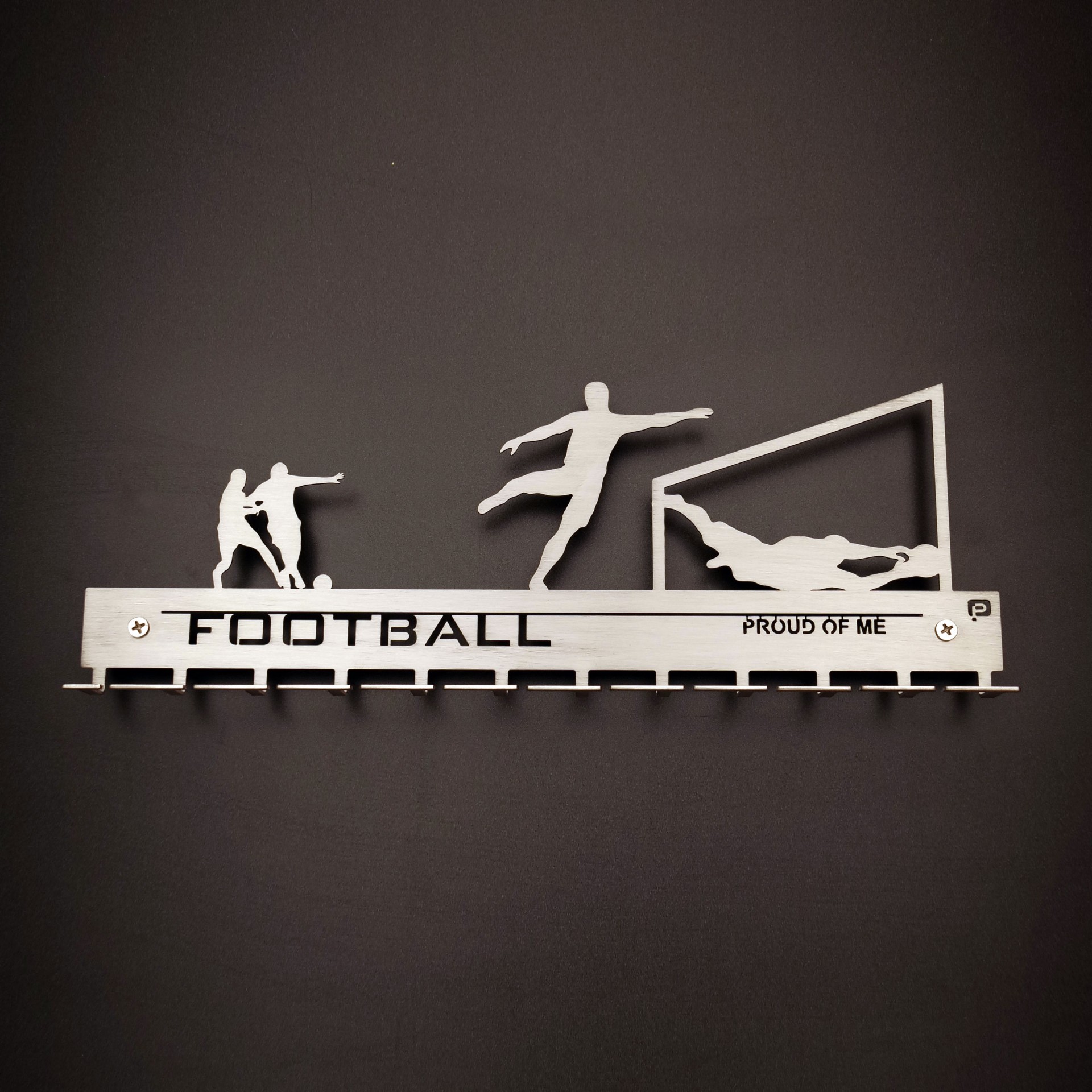 Goloooooooooo! Equipa, finta, disputa, entrega e competição no futebol presentes neste porta medalhas.